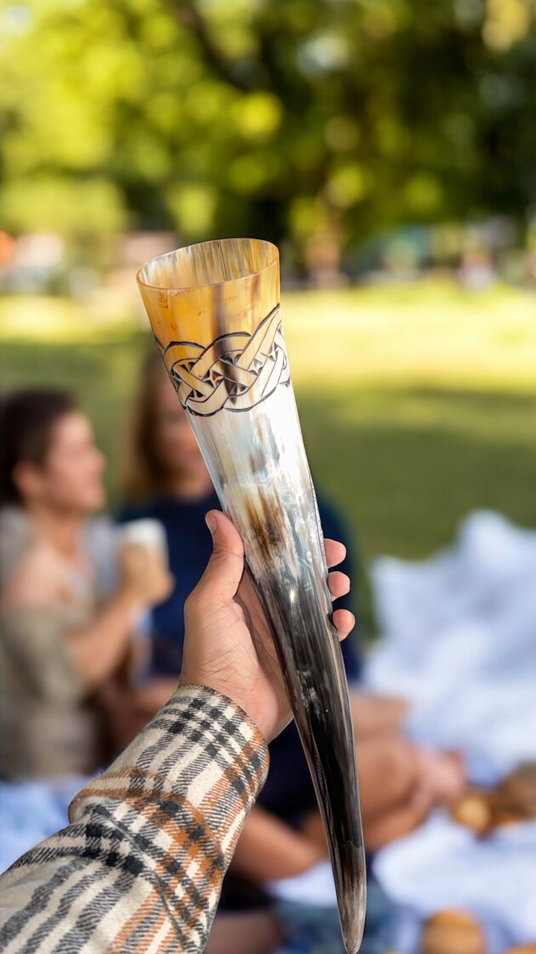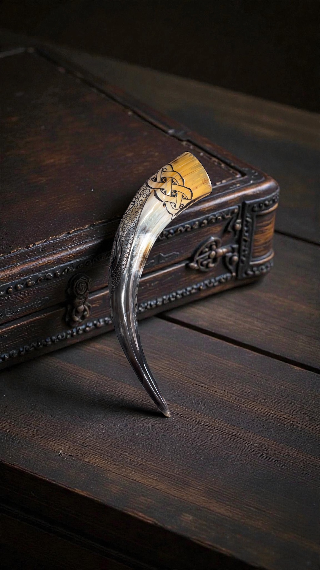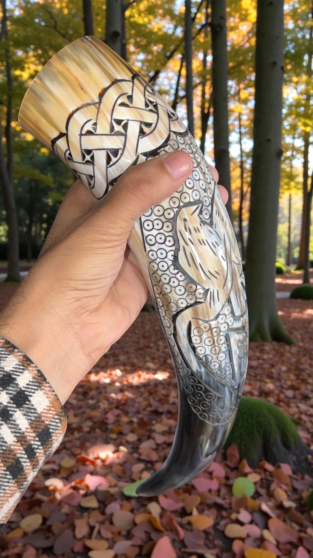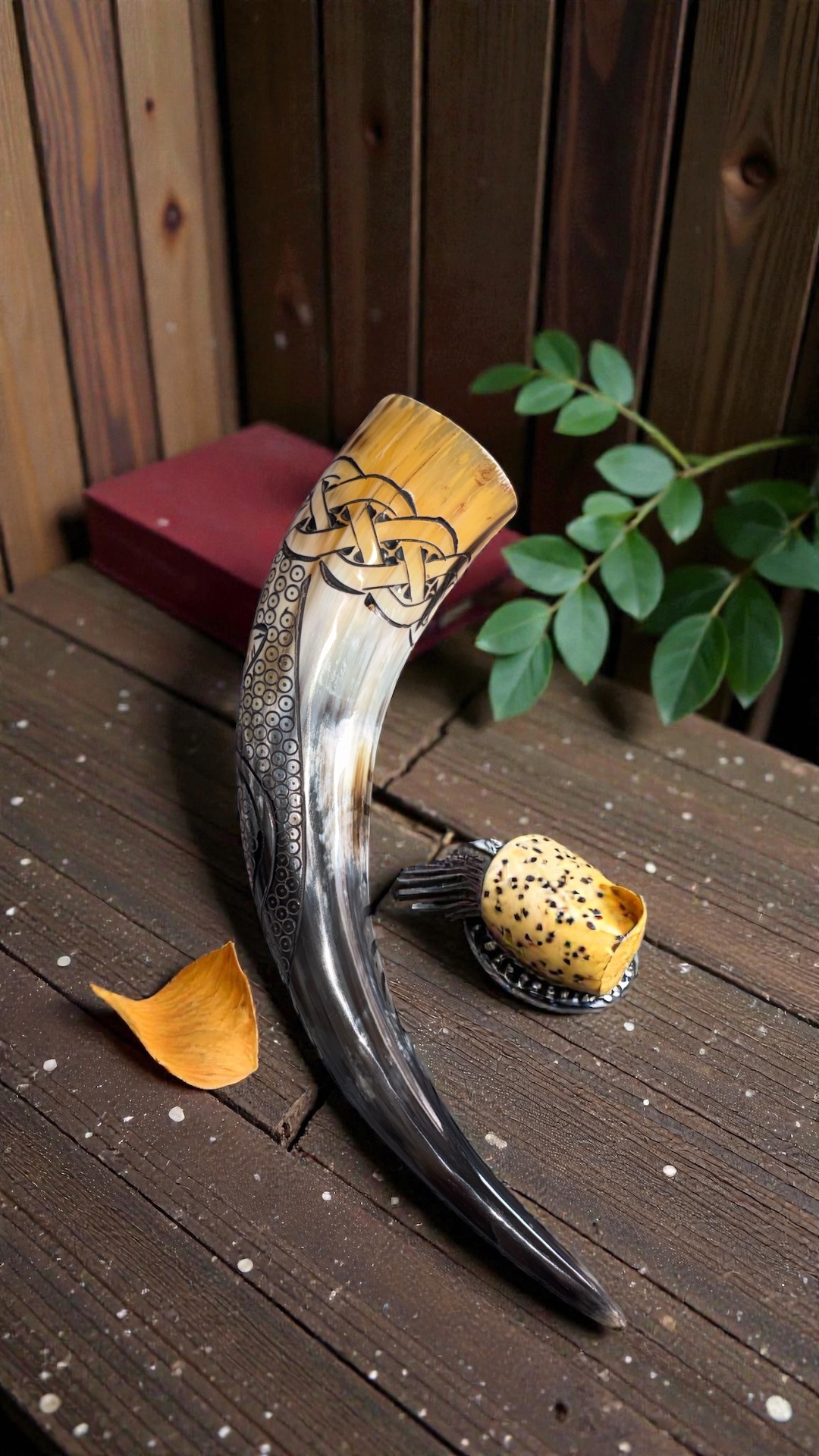 Celebrate ancient tradition with this Handcrafted Viking Drinking Horn, made from 100% natural ox horn and beautifully engraved with elegant Nordic-inspired patterns. Featuring a natural gradient from light ivory to deep black, this horn reflects raw strength, craftsmanship, and heritage.